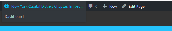 Use the “Edit Page” button to edit the content on each page you visit. The “New” menu gives you a shortcut for creating all different kinds of new content (new posts, media uploads, new events, etc.). If you’ve got something a bit more complicated to do than edit content on a given page, you’ll want to use the dashboard. Hover over the little thing that looks like a speedometer next to the site name and you’ll see a dropdown menu with the dashboard page in it: