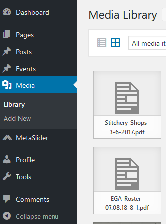 Most of the items on the dashboard should be self-explanatory. Pages, Posts, Events, and Media on the sidebar take you to menus with collections of all the content on the site with those types.